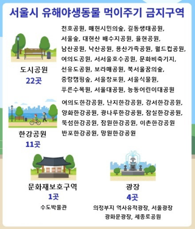 서울시는 광화문광장, 서울숲, 여의도공원, 한강공원 등 38곳을 ‘유해 야생동물 먹이주기 금지구역’으로 지정하고, 향후 3년간 시범 운영할 예정입니다.